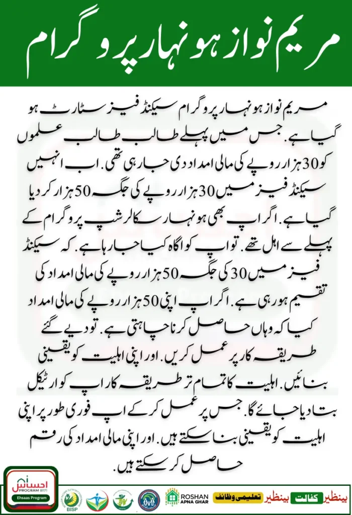 The Honhar Scholarship Program has many objectives. In the Honhar Scholarship Program, you will be given financial assistance through four phases. The first phase of assistance has been received. The second phase has now been started. And it is being told that in the recent meeting, Maryam Nawaz has promised.