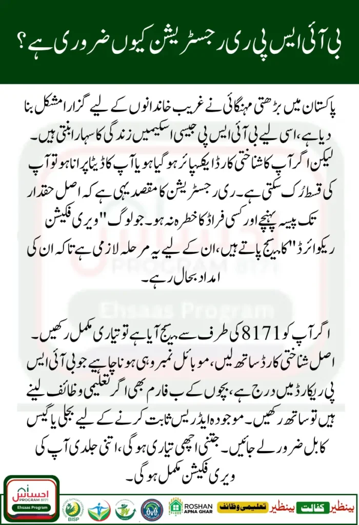 In July 2025, the BISP management has started a fresh re-registration and verification drive for families whose data may be outdated or incomplete. If your CNIC shows “Verification Required” or you got an official SMS from 8171, you must complete this process. It is not just a formality — re-verification ensures your details are correct, fraud is prevented, and support reaches only those who truly need it.