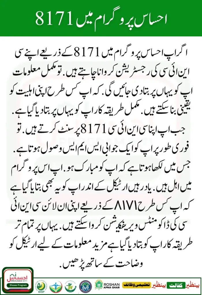 If you want to register your CNIC through 8171 Check in the Ehsaas program. So complete information will be given to you here. How can you ensure your eligibility? The complete procedure has been explained here. When you do your CNIC 8171 percentage. So immediately you receive a reply SMS.