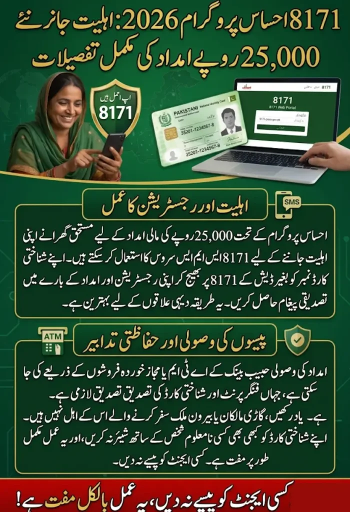 احساس پروگرام پاکستان کے کروڑوں غریب گھرانوں کے لیے امید کی کرن ہے۔ یہ پروگرام مالی مشکلات کا شکار خاندانوں کو ہنگامی نقد امداد اور ماہانہ وظیفہ فراہم کرتا ہے۔ اگر آپ 25,000 روپے کی امداد کے لیے اپنا CNIC اسٹیٹس چیک کرنا چاہتے ہیں تو 8171 ویب پورٹل یا SMS کے ذریعے آپ آسانی سے اپنی اہلیت جان سکتے ہیں۔ یہ طریقہ خاص طور پر دیہی علاقوں کے لوگوں کے لیے کارآمد ہے جن کے پاس انٹرنیٹ کی سہولت نہیں ہوتی۔