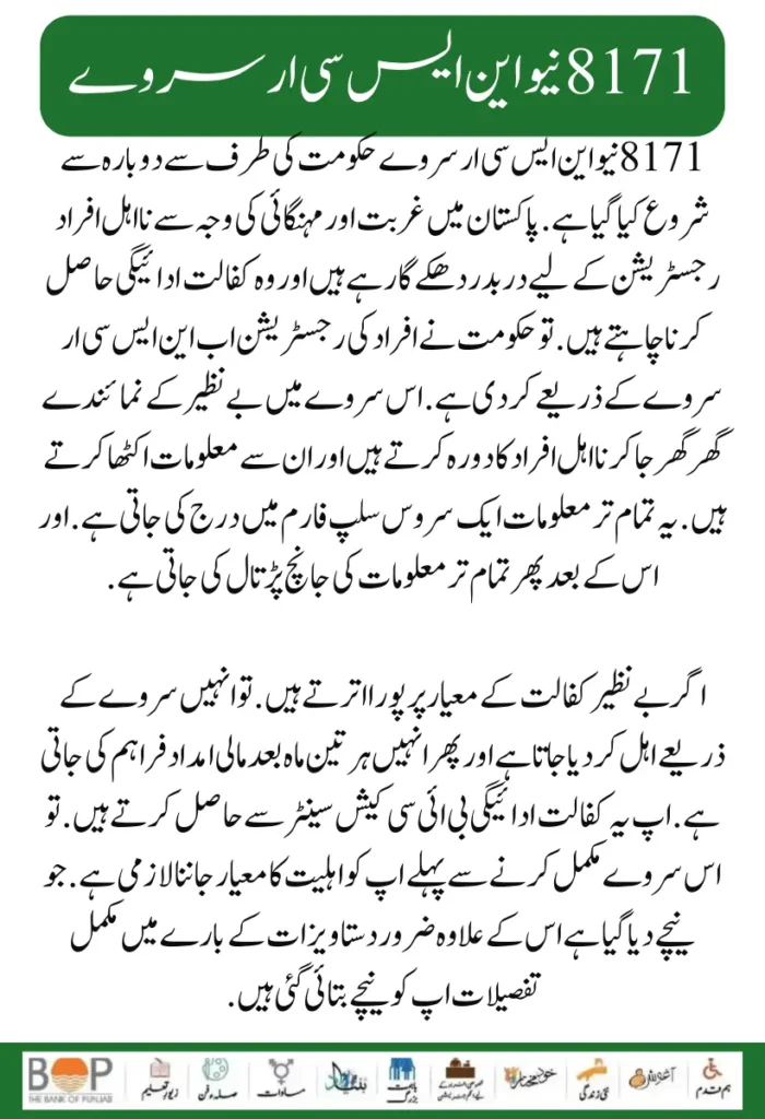 Benazir Income Support Program has re-launched 8171 New Sir NSCR survey for ineligible persons. Those persons who want to ensure their registration and eligibility through this survey. So, definitely participate in this survey. And ensure your eligibility and get financial assistance of 10500 rupees every three months from the government. For any further information, keep visiting the official website Ehsaas 8171 News.