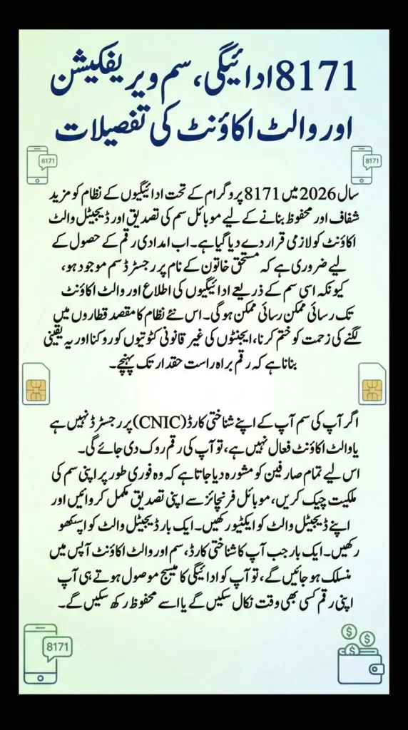 8171 Payment SIM Verification in Pakistan has become a lifeline for millions of low-income families, and in 2026 the process is being further improved through SIM verification and wallet-based payments. These changes aim to reduce fraud, ensure transparency, and make it easier for beneficiaries to receive their funds without long queues or repeated visits. Understanding how SIM verification and wallet accounts work together is now essential for anyone enrolled in the 8171 program.