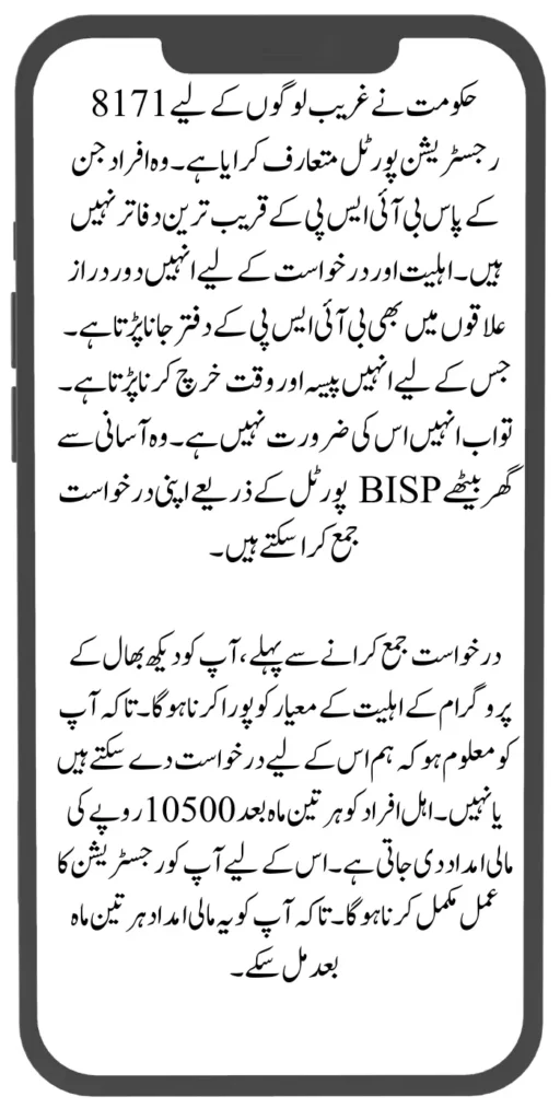 8171 registration portal has been introduced by Govt for poor people. Those persons who do not have the nearest BISP offices. They have to go to the BISP office even in remote areas for eligibility and application. For which they have to spend money and time. So now they don’t need it. They can easily submit their application through the BISP portal at home.