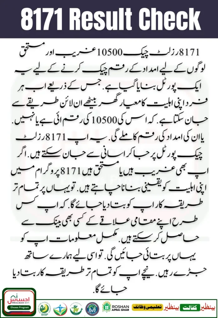 If you want to ensure your eligibility in the 8171 Ehsaas program. So you will be told the complete procedure here. How you can ensure your eligibility in the Ehsaas 8171 program. Eligibility procedure is very easy how you can make sure you. Read the above article with an explanation of all the procedures. Remember you can confirm your eligibility in two ways. One method is online and the other method is 8171 SMS. To ensure eligibility you can also check eligibility from your local area. Remember you have to go to the 8171 program office.