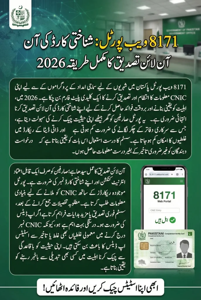 8171 Web Portal CNIC Confirmation 2026 has become a key platform for citizens in Pakistan to manage and verify their CNIC information for social assistance programs. In 2026, confirming your CNIC online is crucial for ensuring eligibility and receiving timely benefits. The portal allows users to check their status from home, reducing the need to visit government offices and minimizing errors in personal data records. Using the system correctly ensures that applicants receive accurate information without unnecessary delays.