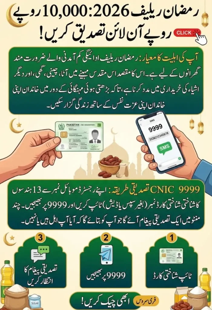 The 9999 CNIC Check Online 2026 program is a government relief initiative that allows eligible citizens to verify and receive a Rs 10,000 Ramadan relief payment from home using their CNIC number.