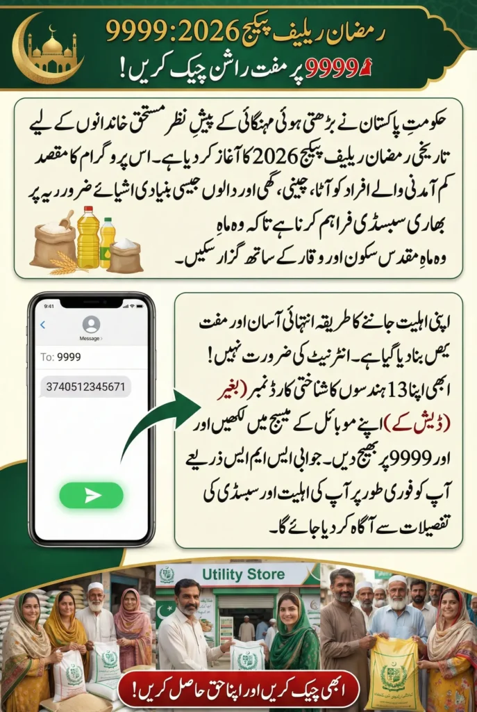 Government of Pakistan has continued its welfare initiatives by launching the Ramzan Relief Package 2026 to support low-income families during the holy month of Ramzan. Due to rising inflation and increasing living costs, many households struggle to afford basic food items. To address this challenge, the government has introduced an easy and transparent system known as the 9999 Online CNIC Check, allowing citizens to verify their eligibility using their CNIC number through SMS.