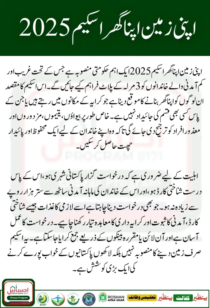 Apni Zameen Apna Ghar Scheme 2025 is one of the most important initiatives by the government of Pakistan to help poor and middle-class families build their own houses. Rising rents, lack of proper housing, and increasing construction costs have made it very difficult for ordinary people to even dream about owning a home. This scheme has been designed to address exactly this issue.