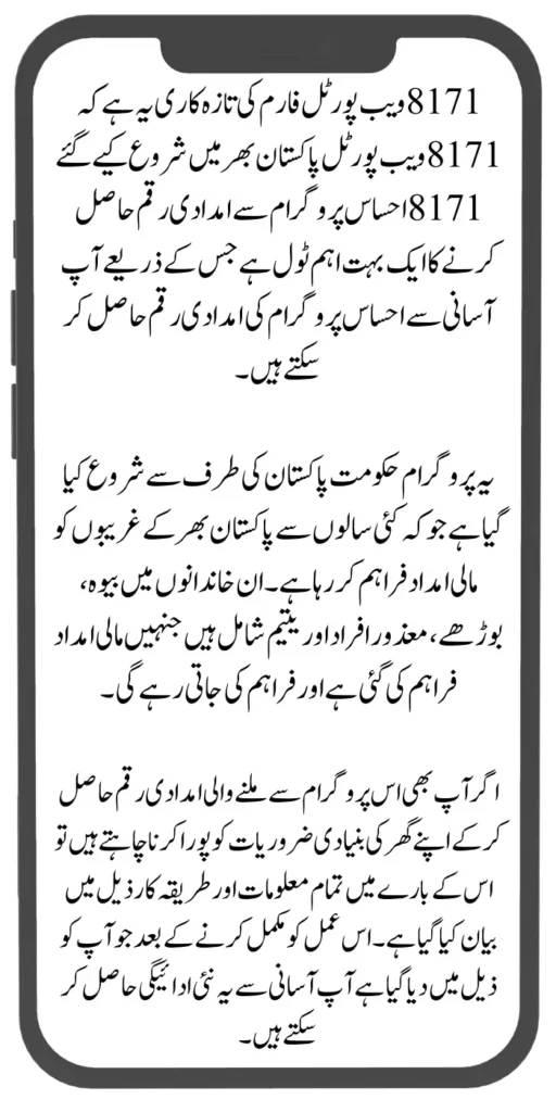 The update of the 8171 web portal form is that the 8171 web portal is a very important tool to get assistance money from the 8171 Ehsaas program launched across Pakistan through which you can easily get Ehsaas program assistance money.