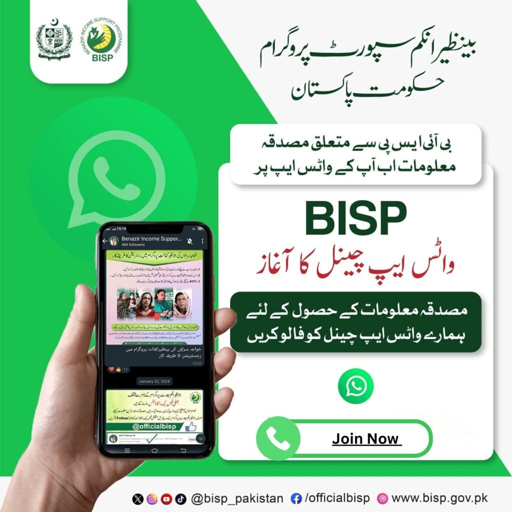بے نظیر انکم سپورٹ پروگرام کی طرف سے حکومت پاکستان نے ایک افیشل واٹس ایپ چینل لانچ کیا ہے . جس کے ذریعے اپ کو تمام تر معلومات پہلے بتا دی جائیں گی . کہ اپ کو اس بار کتنی امداد کی رقم دی جائے گی . اور اس پروگرام میں کن لوگوں کو اہل کیا جائے گا . اسی لیے حکومت پاکستان نے واٹس ایپ چینل لانچ کیا ہے . جس میں تمام تر معلومات اپ کو پہلے بتا دی جائیں گی . کہ اپ اس پروگرام میں کتنی امداد کی رقم حاصل کر سکتے ہیں .مکمل طریقہ کار اپ کو یہاں پر وضاحت کے ساتھ بتا دیا جائے گا . ارٹیکل کو وضاحت کے ساتھ پڑھیں .