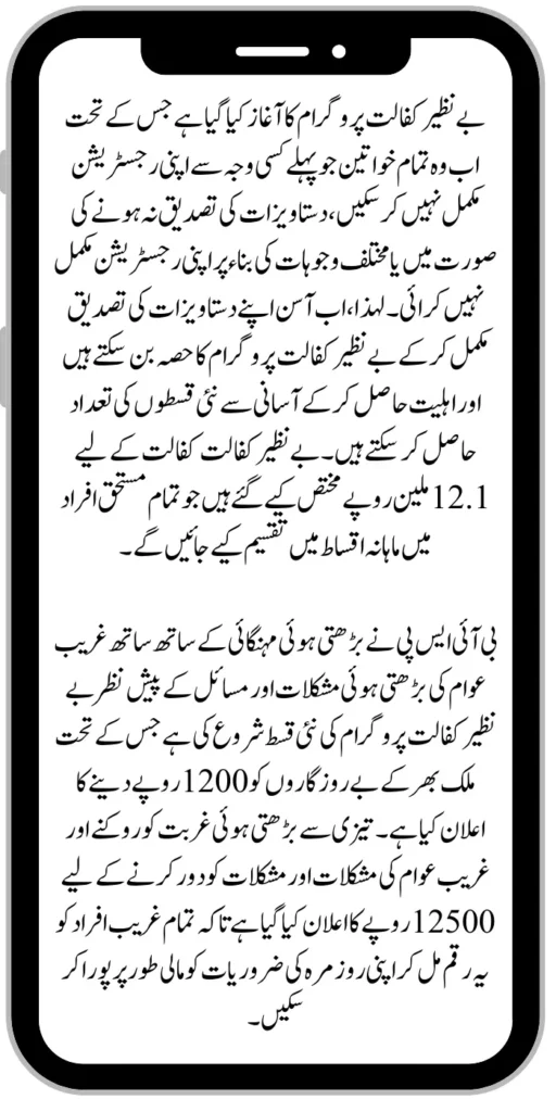 Benazir Kafaalat Program has been launched by BISP under which women who are no longer eligible can become a part of this program and become eligible after completing their registration and verification of their documents. 12.1 million has been allocated for the Benazir Kafalat program under which all the poor and deserving people will be given this amount in installments.BISP has announced giving new instalments of 12500 to all under Benazir Kafalat.