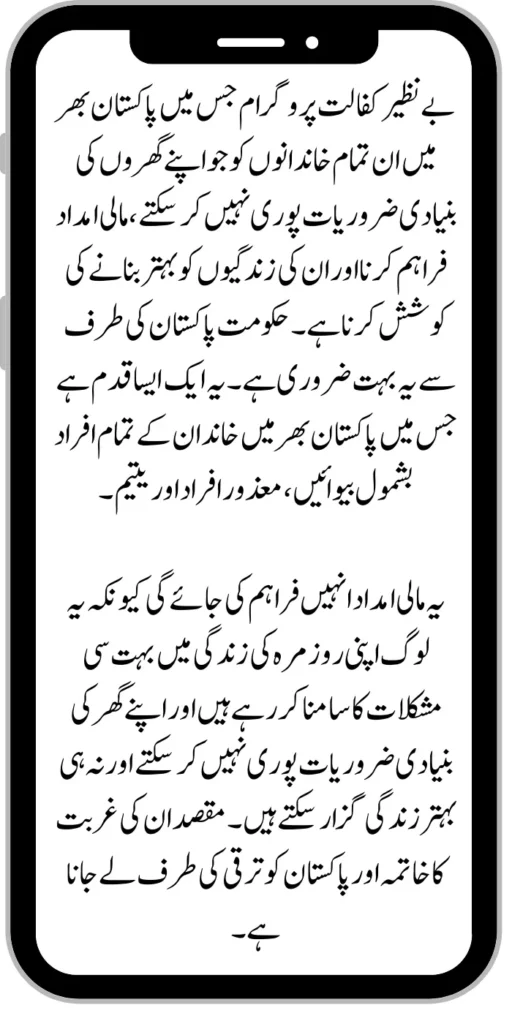 Benazir Kafaalat program in which all the families across Pakistan who cannot meet the basic needs of their homes are to provide financial assistance and try to improve their lives. This is very important for the government of Pakistan. It is a step in which all family members across Pakistan including widows, disabled persons and orphans.