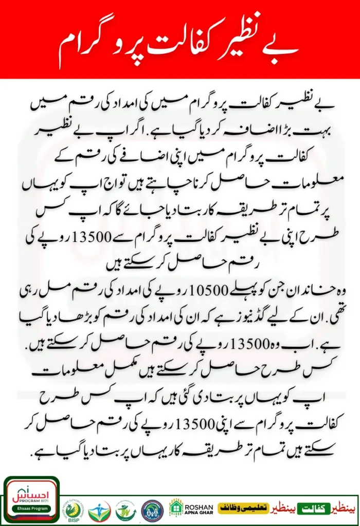 The amount of assistance under the Benazir Kafalat Program has been increased significantly. The amount of Rs. 10,500 has been increased to Rs. 13,500. Along with this, the amount of your assistance has also been made available through the online method. Now you can get your assistance through your bank ATM.