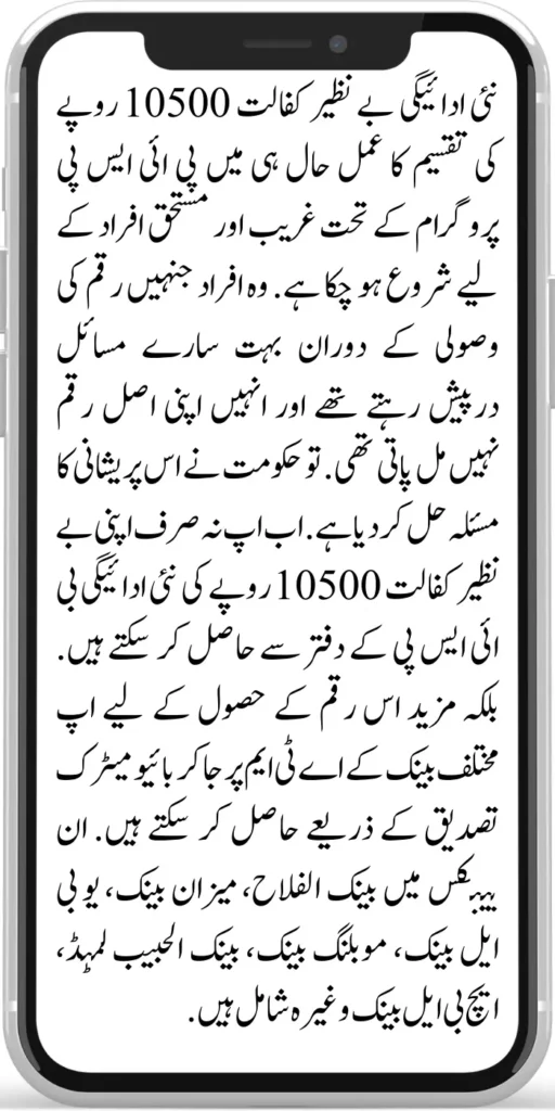 Now Eligible families in the Benazir Income Support Program can visit your bank to get Benazir Kafalat 10500. The government has recently agreed with six more banks. These banks include Bank Alfalah, Meezan Bank, UBL Bank, Bank Al Habib Limited, HBL Bank, and Mobiling Bank.