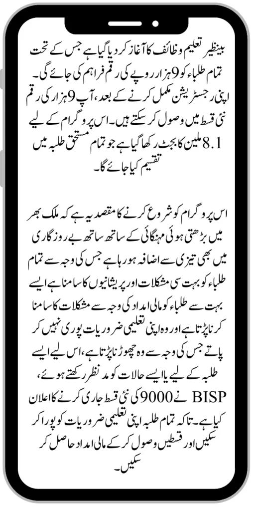All those students who have not yet completed their registration in the Benazir Taleemi Wazaif Program and are eligible for this program if their criteria are as they mentioned, then this is a golden opportunity for them. Now they can become a part of this program by completing their easy registration and getting the new installment amount of 9 thousand.
