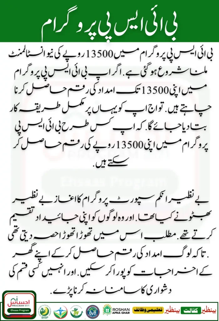BISP 13,500 new installment of Rs 13,500 has started in the BISP program. If you want your assistance amount of up to Rs 13,500 in the BISP program. Then today you will be told the complete procedure here. How you can get your Rs 13,500 in the BISP program.Β