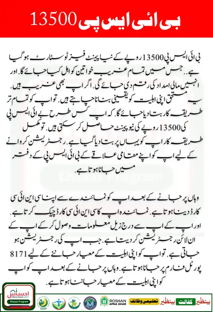 BISP payment of Rs 13500 is being given to you in phase two. It has many benefits. New families can also get this money. They need to conduct their own survey. Those women who are receiving assistance money first. They should get their fingerprint verified. And get your grant money immediately.