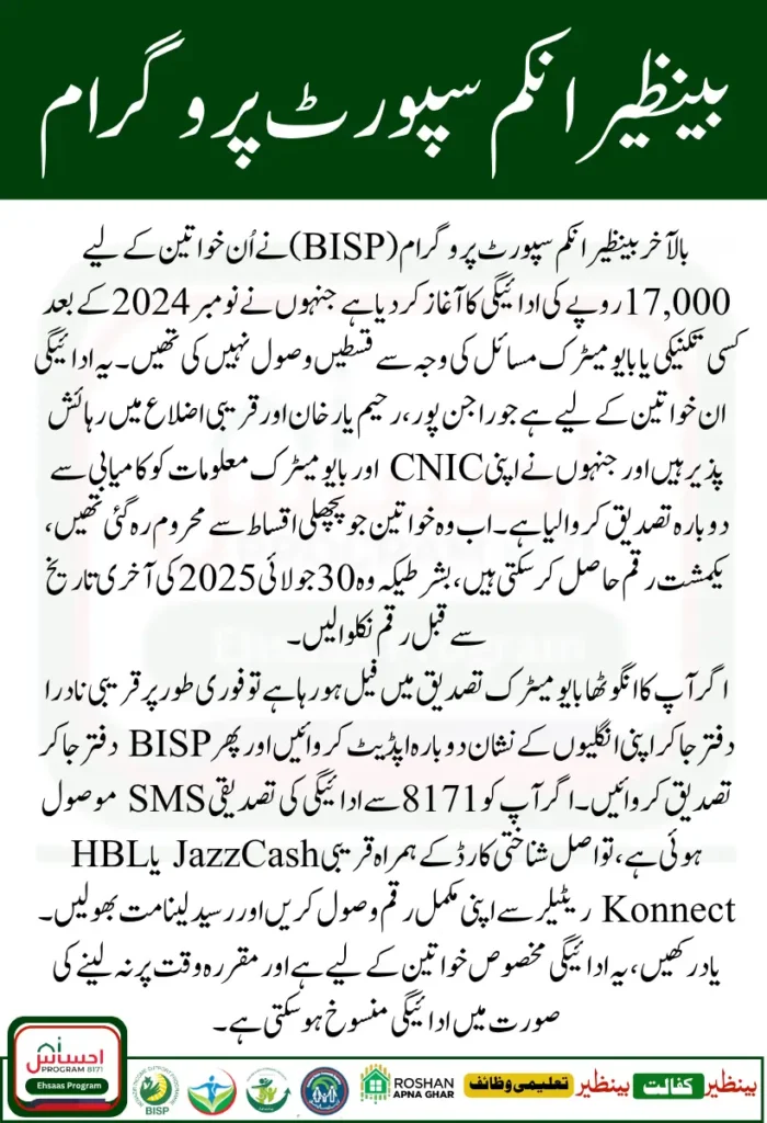 | Payment Channels | 🛒 JazzCash Retailer 🏦 HBL Konnect 🏢 BISP Tehsil Office (for complex/verifying cases) |