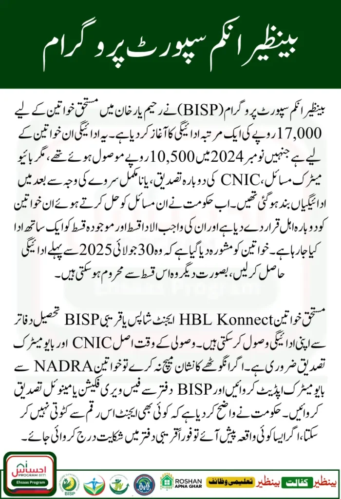 اگر آپ رحیم یار خان کی رہائشی ہیں اور آپ کو نومبر 2024 کے بعد سے BISP کی قسط موصول نہیں ہوئی، تو یہ آپ کے لیے سنہری موقع ہے۔ حکومت نے اُن تمام خواتین کے لیے 17,000 روپے کی خصوصی ادائیگی جاری کی ہے جن کے بایومیٹرک یا کاغذات میں مسائل تھے۔ اب ان مسائل کو حل کر دیا گیا ہے، اور آپ اپنے CNIC کی تصدیق کے بعد مکمل رقم حاصل کر سکتی ہیں۔ بس اپنا اصل شناختی کارڈ لے کر قریبی HBL Konnect دکان یا BISP دفتر جائیں اور تصدیق کے بعد رقم وصول کریں۔