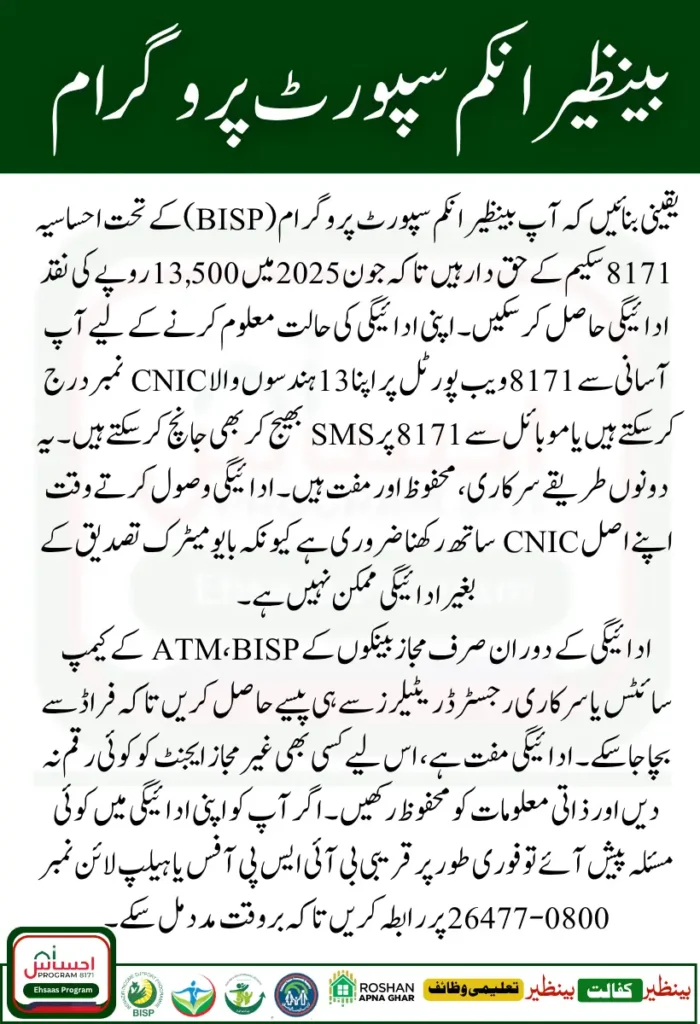 BISP 8171 June 2025 under the Ehsaas 8171 initiative continues to provide critical financial relief to low-income families across Pakistan. In June 2025, eligible beneficiaries will receive a payment of Rs. 13,500, distributed in phases to ensure smooth processing and transparency. If you or someone in your household is enrolled in the program, understanding how to verify your payment status and collect the cash safely is essential.