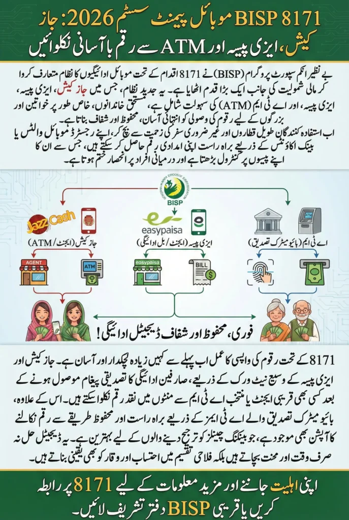 The introduction of mobile and ATM-based withdrawal options under BISP 8171 has significantly improved the payment experience for beneficiaries across Pakistan. By offering JazzCash, EasyPaisa, and ATM channels, the program ensures flexibility, safety, and ease of access for millions of families.