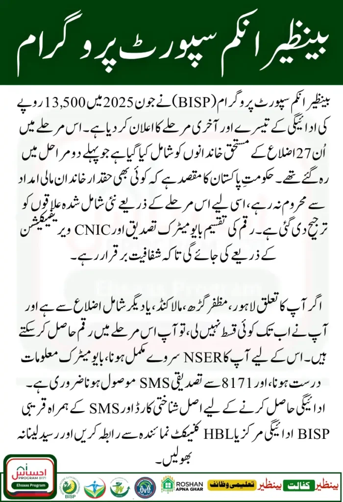 The launch of the BISP 8171 Phase 3 payment cycle in June 2025 marks an important milestone in the Government of Pakistanβs efforts to support vulnerable families. This phase targets districts that missed out previously, offering Rs. 13,500 to eligible women registered under the Kafalat program.