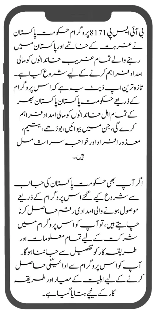 The BISP 8171 program has been launched by the government of Pakistan to eradicate poverty and provide financial assistance to all poor families living in Pakistan. The latest update is that through this program, the government of Pakistan will provide financial assistance to all eligible families across Pakistan, including widows, elderly people, orphans, disabled people and transgenders.