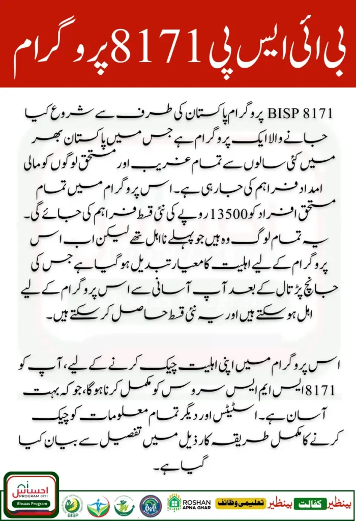 BISP 8171 پروگرام کے تحت پاکستان بھر کے تمام ضرورت مند اور مستحق افراد میں 13,500 روپے کی نئی قسط تقسیم کی جائے گی۔ یہ نئی قسط ان تمام لوگوں کو دی جائے گی جو اپنی اہلیت کی حیثیت کی جانچ کر سکیں گے۔