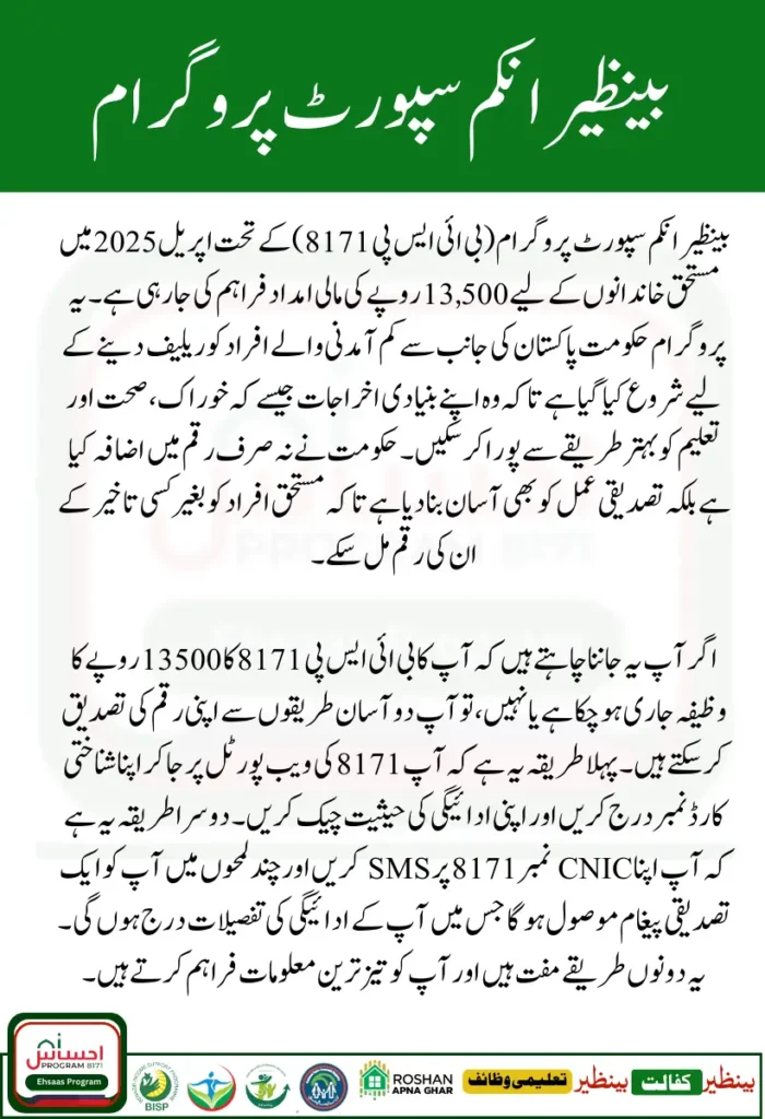 BISP 8171 Update April 2025 has officially begun disbursing payments of Rs. 13,500 to eligible beneficiaries. This latest update aims to provide financial relief to deserving families amid rising inflation. If you want to receive this payment or check your eligibility, this guide covers everything you need to know, including payment details, eligibility criteria, and how to verify your status online or via SMS.