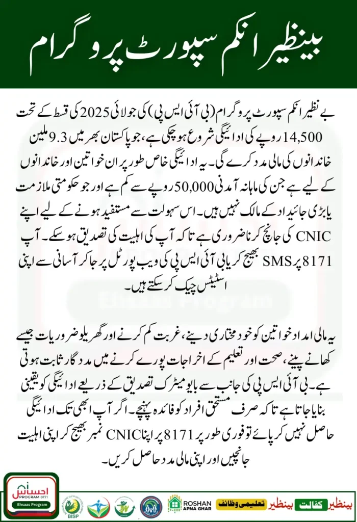 BISP 8171 Web Portal July 2025 Update has officially released PKR 14,500 for eligible families in its July 2025 disbursement. This marks the final installment of the April–July 2025 payment cycle, providing crucial financial aid to 9.3 million households across Pakistan.