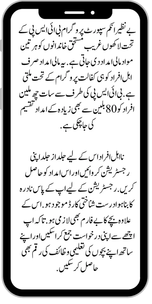Under the Benazir Income Support Program (BISP), millions of poor and deserving families are given financial assistance every three months. This financial assistance is available only to eligible persons under the sponsorship program. Aid of more than 80 billion has been distributed to seven to six million people by BISP.Β