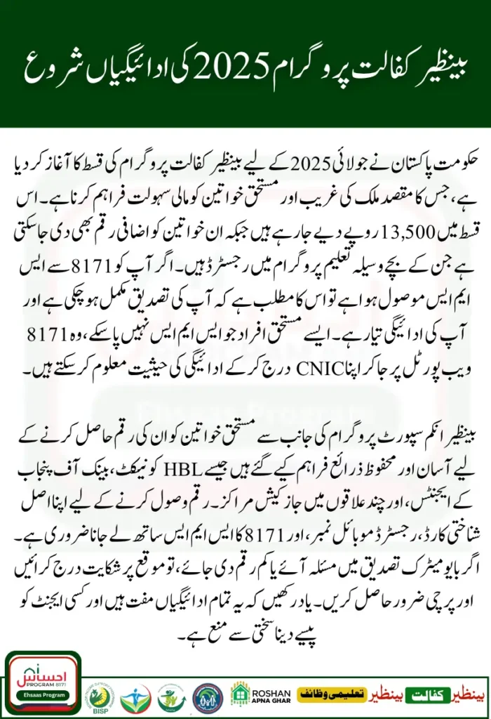 The Government of Pakistan has officially launched the BISP Kafalat Program July 2025 Payments cycle for the Benazir Income Support Programme (BISP) Kafalat initiative, a critical financial aid program aimed at empowering low-income women across the country. If you’re a registered beneficiary, you may have already received a payment message from 8171, BISPβs official SMS code, notifying you that your new installment is now available for collection.
