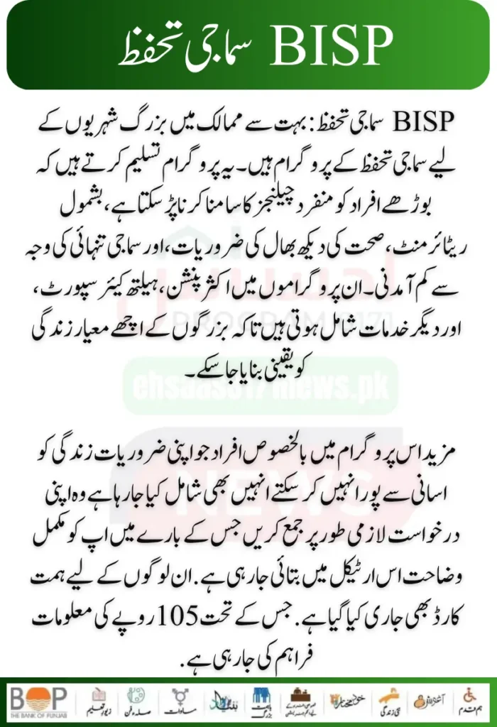 BISP Social Protection: Many countries have social protection programs for senior citizens. These programs recognize that older individuals may face unique challenges, including reduced income due to retirement, healthcare needs, and social isolation. These programs often include pensions, healthcare support, and other services to ensure seniors’ decent quality of life.