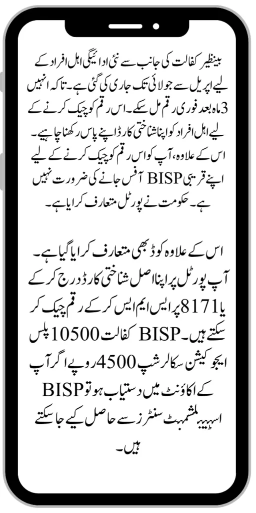Apart from this, the code has also been introduced. You can check the amount by entering your original ID card on the portal or by sending an SMS to 8171. BISP kafalat 10500 plus Taleemi Wazaif Rs 4500 if available in your account can be availed from BISP Establishment Centers.