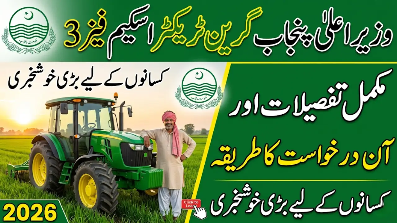 وزیراعلیٰ پنجاب کی سبز ٹریکٹر سکیم فیز 3 2026 کسانوں کے لیے ایک اہم منصوبہ ہے جس کا مقصد چھوٹے اور درمیانے کسانوں کو جدید زراعتی مشینری فراہم کرنا ہے۔ اس سکیم کے تحت کسانوں کو ٹریکٹر خریدنے کے لیے مالی مدد دی جاتی ہے تاکہ وہ کم خرچ میں جدید اور موثر ٹریکٹر حاصل کر سکیں۔ یہ اقدام کسانوں کی پیداوار بڑھانے، محنت کو کم کرنے اور زراعت کو جدید بنانے میں مددگار ثابت ہوتا ہے۔ حکومت نے اس سکیم میں شفافیت اور آسانی کو یقینی بنانے کے لیے مکمل طور پر آن لائن درخواست کا نظام فراہم کیا ہے تاکہ ہر مستحق کسان آسانی سے حصہ لے سکے۔