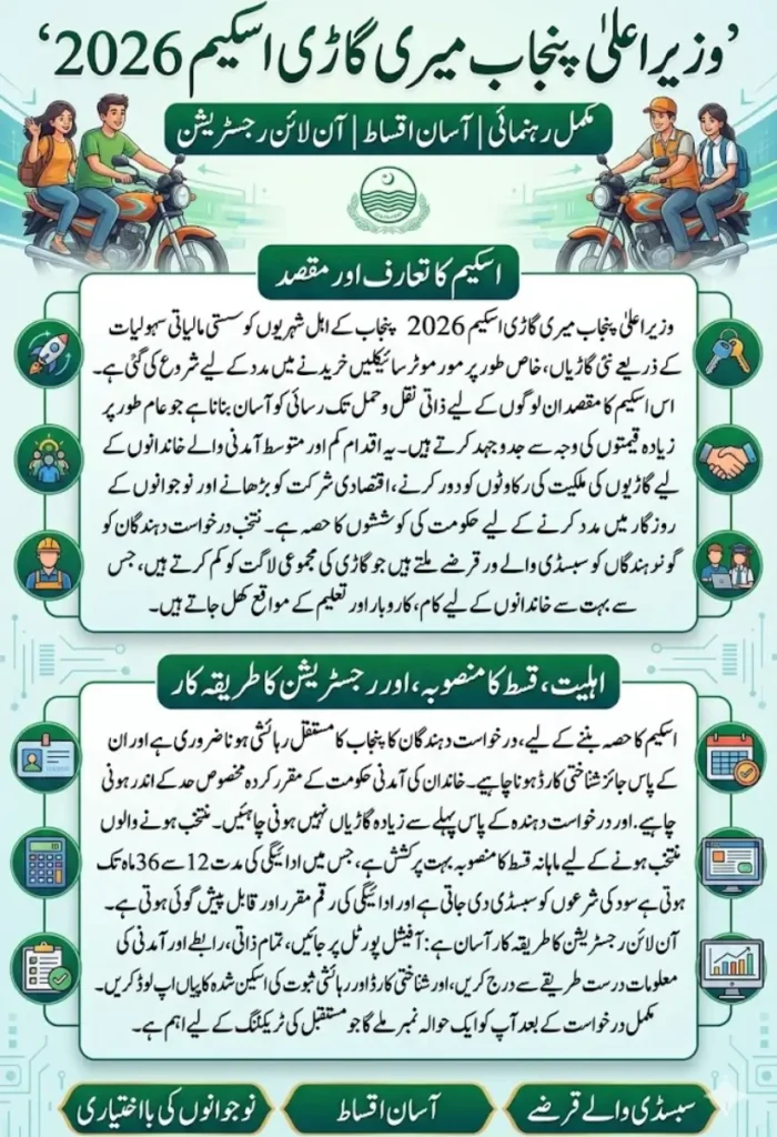 CM Punjab Meri Gari Scheme 2026 provides an important opportunity for eligible residents to access affordable transportation through a structured monthly installment plan. With clear eligibility criteria and an online registration process that is easy to follow, this scheme offers practical support to many families in Punjab.