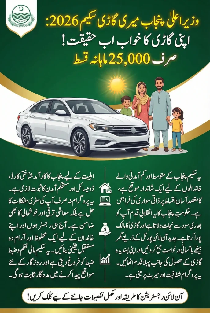 CM Punjab Meri Gari Scheme 2026 is a government initiative aimed at making vehicle ownership affordable for middle- and lower-income families in Punjab. This scheme allows eligible citizens to purchase a car through a structured installment plan, helping them manage costs without taking high-interest loans.