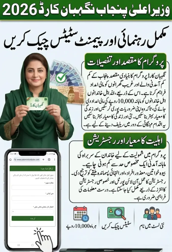 CM Punjab Nigehban Card 2026 is a valuable resource for families facing financial difficulties. By understanding the eligibility criteria, checking the Rs 10,000 payment status, and confirming your name on the beneficiary list, citizens can fully benefit from this program.