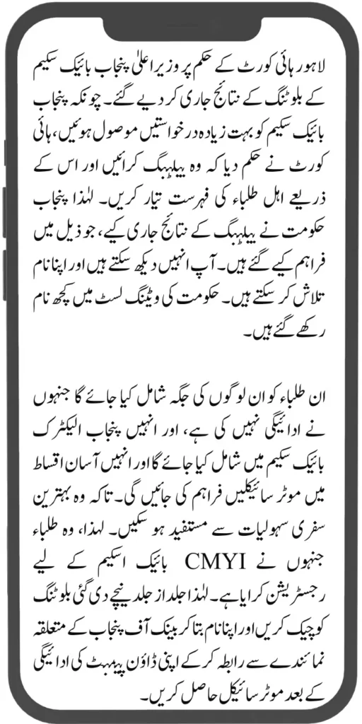 This blotting is a type of lottery in which all the involved persons are fed into the computer data, and a list is prepared with the help of the computer from which the eligible persons are selected. No dishonesty is involved in this blotting; all this work is done through the computer. Therefore, the government has released the CMYY bike scheme bulletin list, which allows eligible students to search for their names and contact the nearest Bank of Punjab to get their bikes.