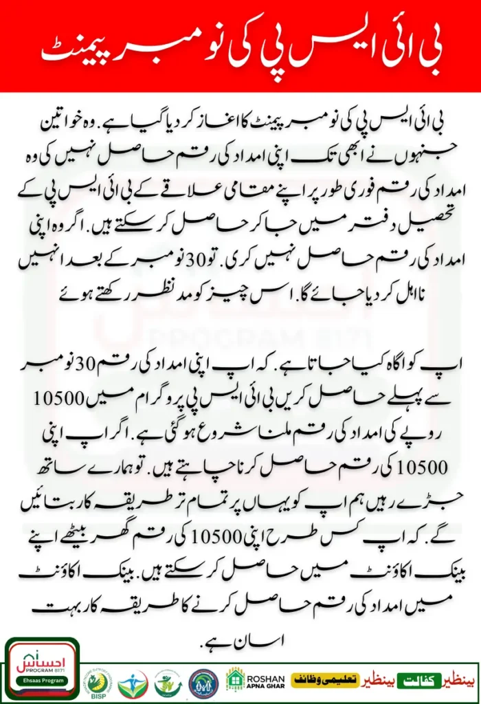 BISP November Payment of BISP has been started. Those women who have not yet received their assistance amount can immediately go to the BISP tehsil office of their local area to get the assistance amount. If they do not receive their assistance amount. Then they will be disqualified after November 30. Keeping this in mind, you are informed. You should receive your assistance amount before November 30.
