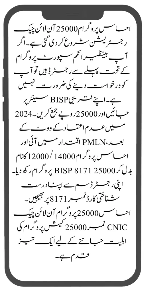 The PMLN came into power and renamed the Ehsaas program 12000/14000 to BISP 8171 25000 programs. Send your valid identity card number to 8171 from your registered SIM. Ehsaas 25000 program online check CNIC number is a quick step to know the eligibility for the 25000 cash program.