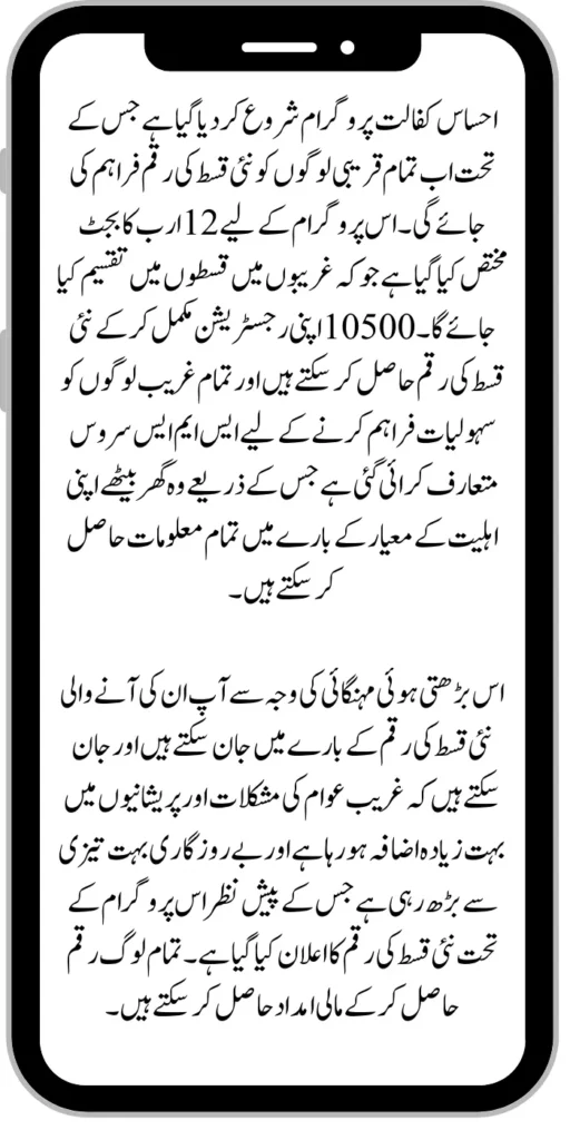 Ehsaas Kafaalat program has been launched under which now all the close people will be provided with new instalment amounts. A budget of 12 billion has been allocated for this program which will be distributed among the poor in installments. 10500 can get a new instalment amount by completing their registration and SMS service has been introduced to provide facilities to all poor people by which they can get all the information about their eligibility criteria sitting at home.