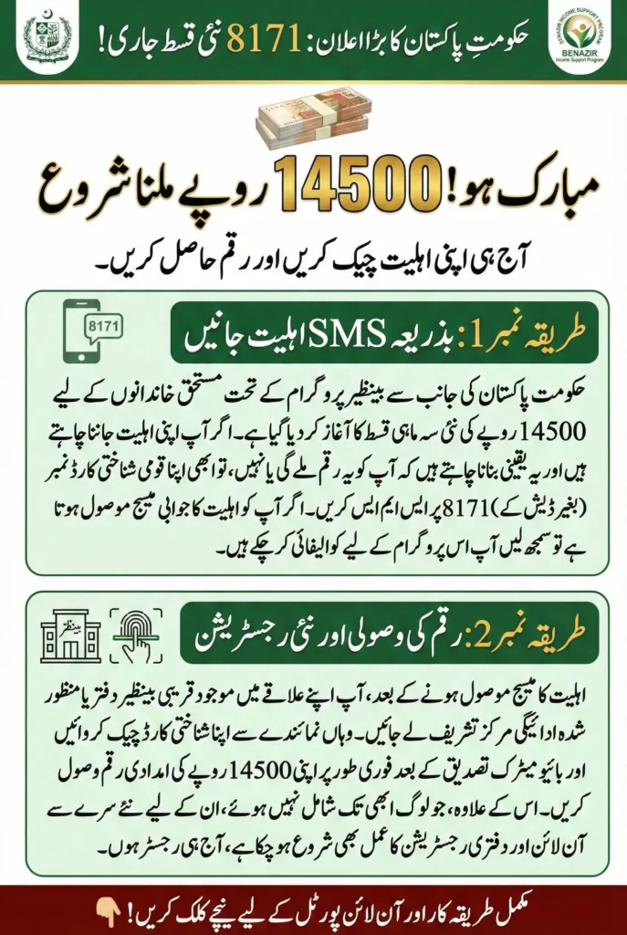 New payment has been started in the Government of Pakistan 8171 program. In which you will get Benazir 14500 rupees in new payment if you want to get your new payment of 14500 rupees. So stay connected with us to know the complete information you have to read the article with explanation. After reading the above article with an explanation.Β