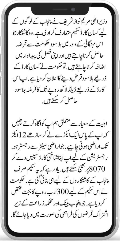 Regarding the eligibility criteria, you should have land registered with the Land Centre from one acre to 12 and a half acres. You can send your ID card space to 8070 for registration. It should be remembered that this scheme has been made only for the farmers of Punjab. The government has allocated a budget of 300 billion rupees for this scheme, which will be given in the form of loans shared by Punjab Bank and the Department of Agriculture.