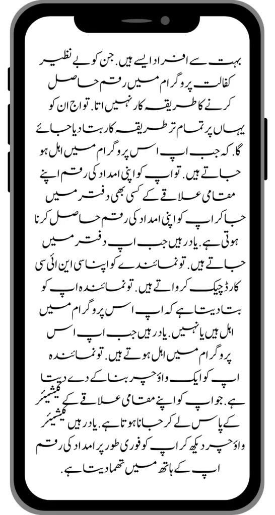 Let the representative check your CNIC card. The representative will then tell you whether you are eligible for this program or not. Remember when you qualify for this program. The representative will then make a voucher and give it to you, which you must take to the cashier in your local area. Remember, the cashier will immediately hand you the aid money after seeing the voucher.
