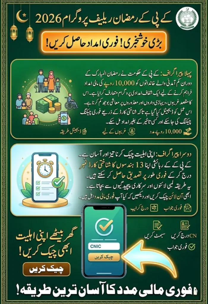 KPK Ramzan Relief Program 2026 is a government initiative aimed at providing timely financial support to families in need during the holy month of Ramzan. The program focuses on easing the economic burden of low-income households and ensuring that support reaches those who genuinely need it. With modern technology, the government has introduced an online CNIC verification system that allows instant confirmation of eligibility.