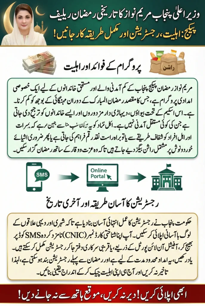 The Maryam Nawaz Ramzan Package is a vital initiative for supporting Punjab’s vulnerable families during Ramadan. With clear eligibility rules, multiple registration options, and timely assistance, the program helps households manage their essential needs in a fair and organized manner.