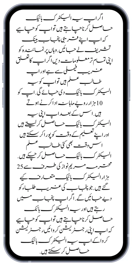If you want to get this Electric Bike Scheme, let us tell you that this Bike Scheme has been started by Maryam Nawaz. These electric bikes will be provided to the students who are currently studying in Punjab. If you want to get this electric bike, make sure to register as soon as possible. Because these electric bikes are kept up to 25 thousand.