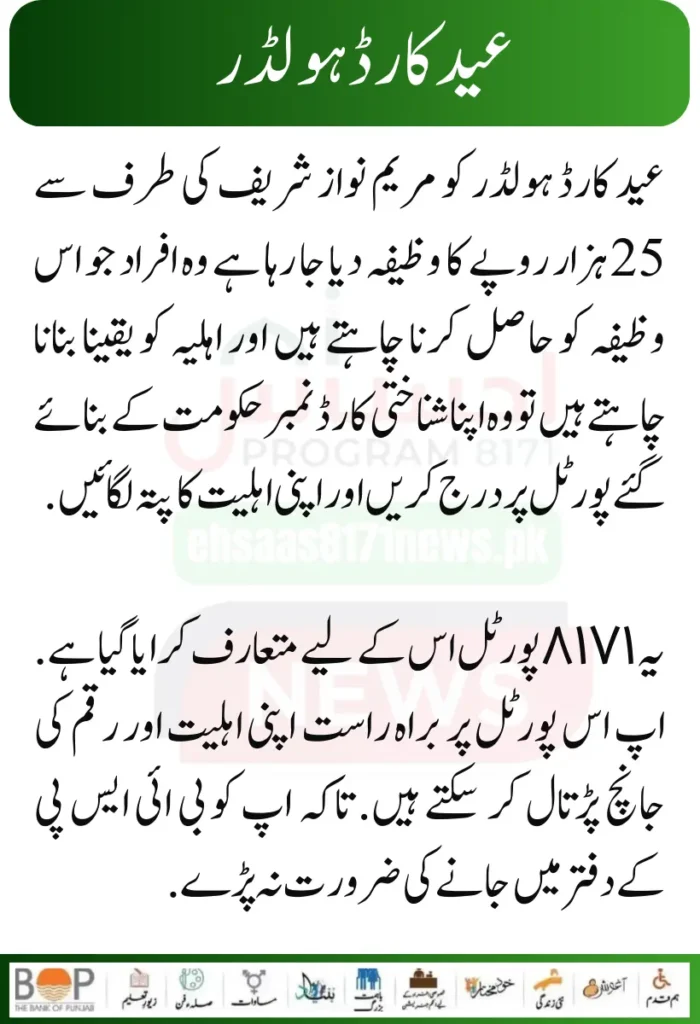 Maryam Nawaz has launched the New 25000 EID Program, which will qualify these people. The government of Pakistan makes its ID cards. That is, those Pakistani residents who have an ID card can ensure their eligibility in this program. You can also get your Eid gift, i.e., your eligibility for the Eid program.
