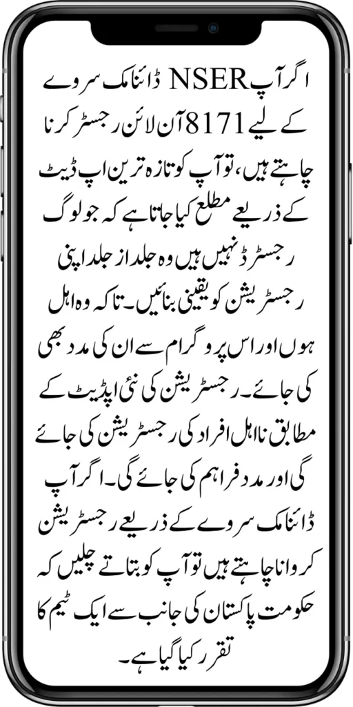 If you want to 8171 register online for the NSER Dynamic Survey, you are informed by the latest update that people who are not registered should ensure their registration as soon as possible. So that they are qualified and this program also assists them. According to the new update of registration, ineligible people will be registered and assistance will be provided. If you want to register through a dynamic survey, let us tell you that the Government of Pakistan has appointed a team.